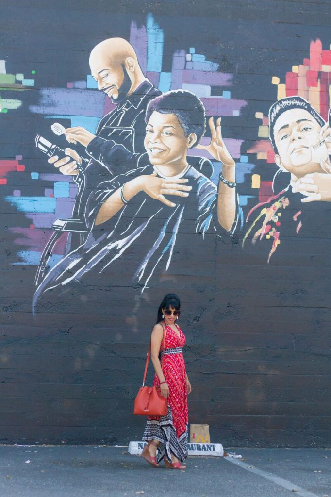 Arpi recently visited this fun wall mural featuring Maya Angelou at a hair salon. The colors in Arpi’s handkerchief dress popped in this background.