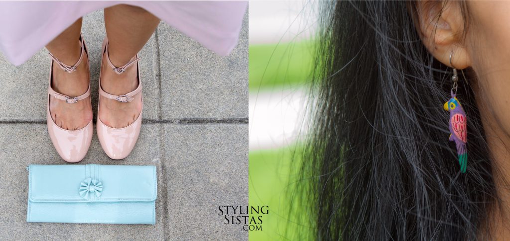 Arpi broke out of the ‘easter colors’ boxed idea and sprung out in wee summer days, pairing blush with aqua. She completed the look with silver block heels and beautiful handcrafted paper art earrings.Blue eye shadow is trending currently and goes well with the blush matte lip color.