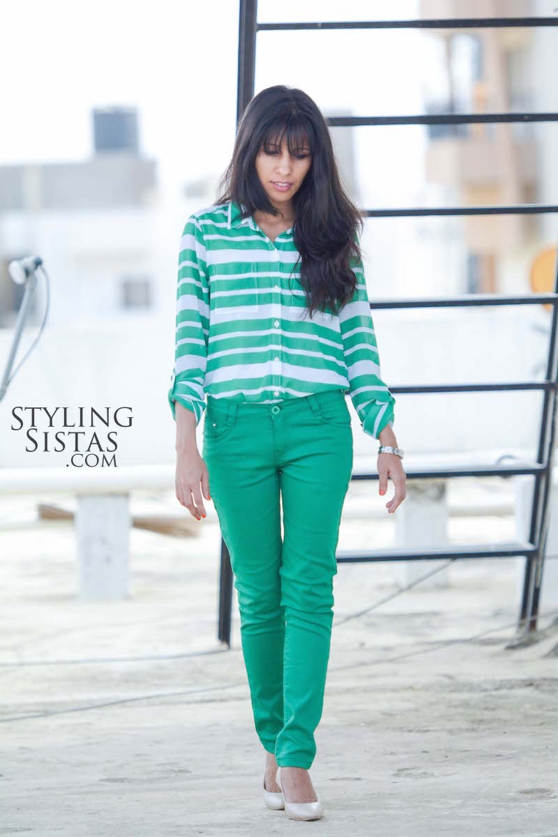 A contrast color stripe handbag of any shape would look equally flattering. Stripes are an interesting geometric shape to play with when styling an ensemble. One needs to be careful of not overdoing it. Imitating this shape in one of the accessories will do the job.
