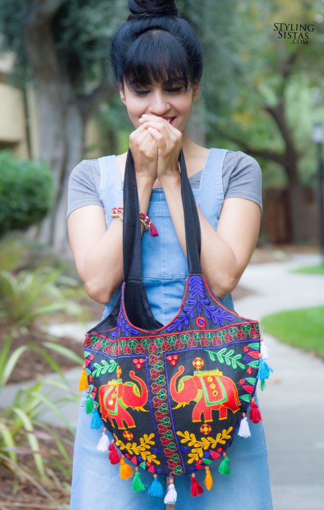 Arpi decided to keep the look simple, with a gray little round neck t-shirt underneath, and black pumps to play off her black hair tied in a top-knot. She went bold only with her berry lip color to make the look a little funky and chose to carry this very colorful cotton handicraft handbag from India, as an ode to the origins of dungaree. Her bracelets are also handcrafted with little tassels to match the handbag.