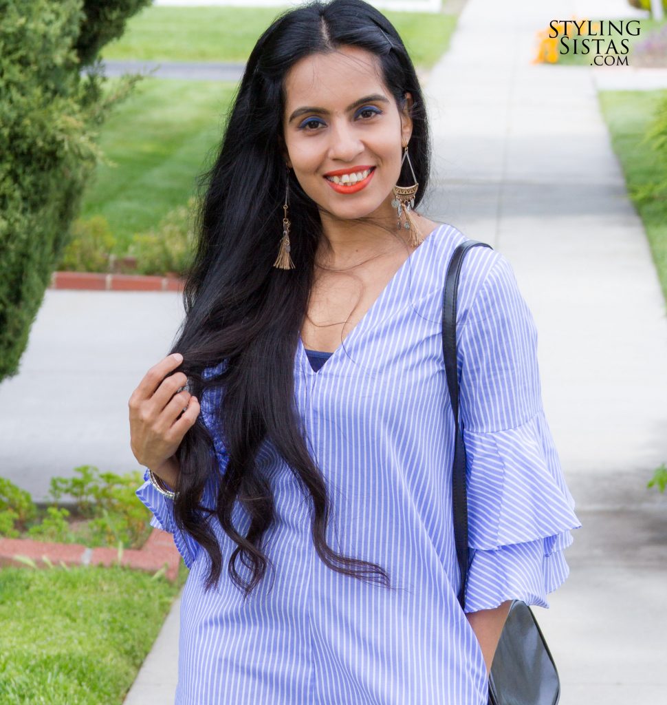 Well, we welcomed spring with open arms since a couple of weeks now. Although its still illusive to us New Yorkers, spring is bright and breezy in sunny California already! So on sunny afternoon in San Jose, Arpi adorns this airy shirt dress with big layered ruffled sleeves that adds extra playfulness to her ensemble.