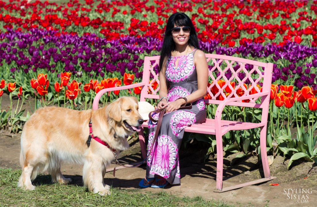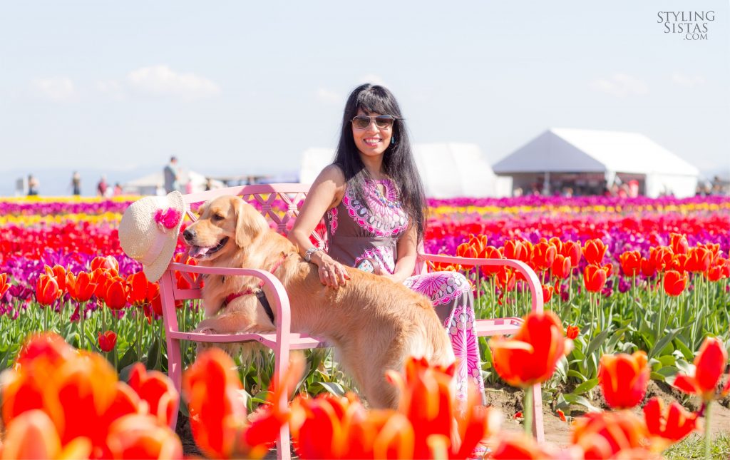 She started her journey with husband, Vivek, and Bella, from Foster City, California and headed to Medford, Oregon. It was a 6-hour drive. They checked in at a cozy little inn, “Inn at the Commons”, for the night as they allow dogs of all sizes. Yes, most hotels don’t allow big dogs, i.e. dogs weighing more than 25lbs, well Bella is a hefty is 65lb Golden Retriever! After a quick nap, they got ready, it was cold in Medford and she wore a sweater and leggings on her ride to the tulip farm. They had a great complimentary breakfast at the inn. The inn even allows dogs to sit at the reception area to enjoy breakfast with their owners!